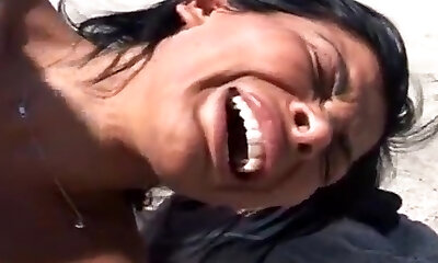 意大利种马粉碎在海滩上的黑头发的摩洛伊斯兰解放阵线与神话般的和巨大的胸部