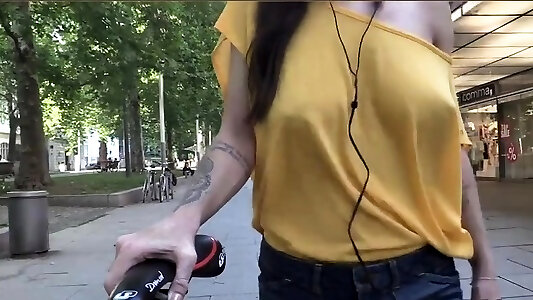 Young euro babe flashing tits outdoors in public space -