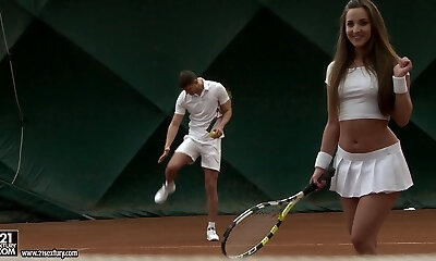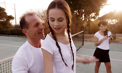 Horny trainer fucks duo of fantastic slim girlies after super-cute tennis game