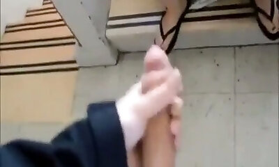 Guy jerks off his fat stiffy at an unsuspecting girl