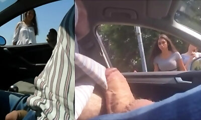 Babe looks into my car and witnesses my rock rigid member